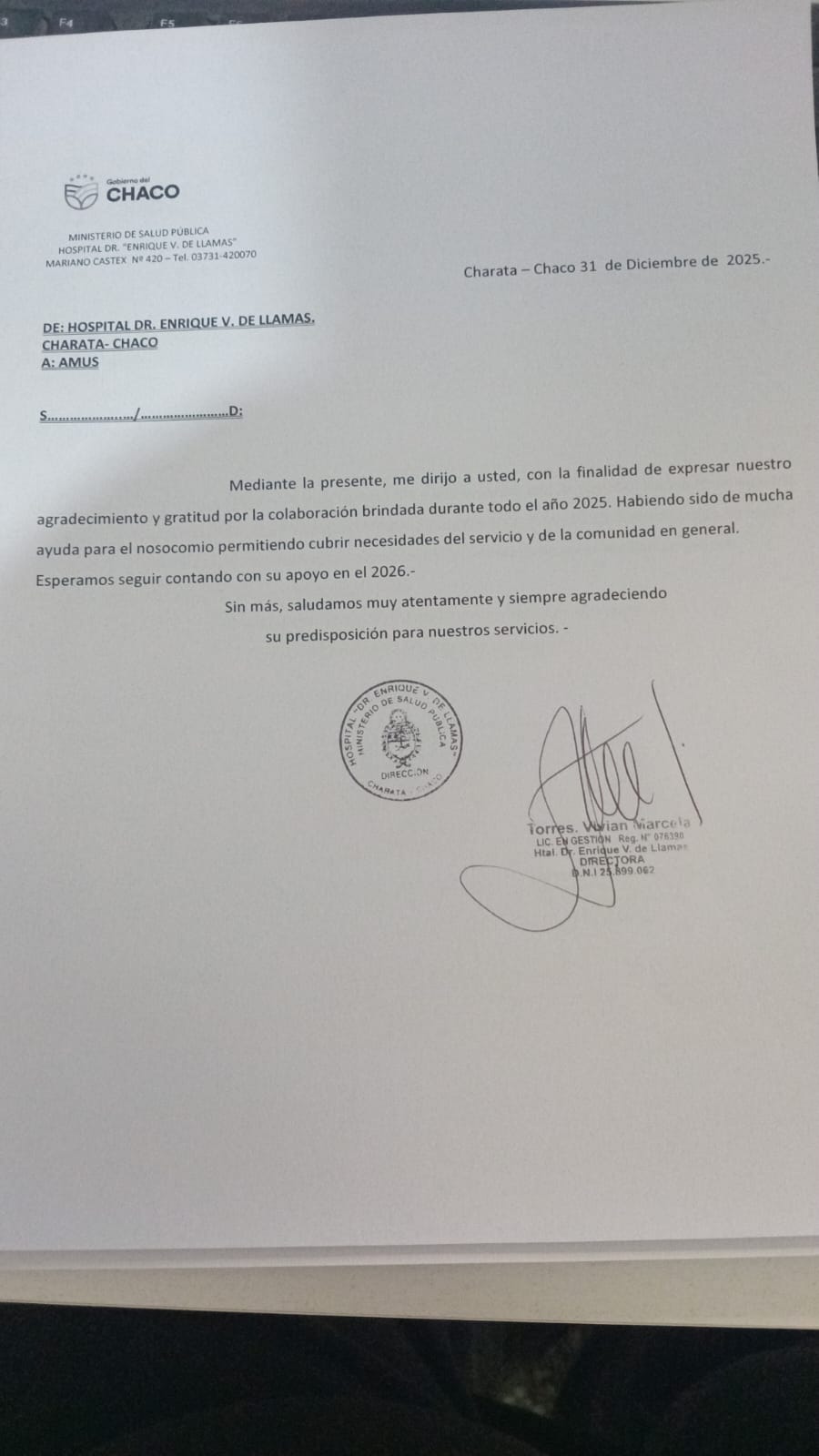 Agradecimiento del Hospital de Charata, Chaco,